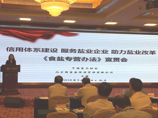 5月23日,由中国盐业协会组织的《食盐专营办法》宣贯会会在北京召开,会议对2017年12月26日公布的中华人民共和国国务院令第696号《食盐专营办法》进行深入解读,并就改革过程中的关键问题进行研讨交流。中国盐业协会茆庆国理事长主持了会议。工信部消费品工业司高延敏司长、卫生健康委员会疾控局严峻处长出席会议,部分盐业主管机构负责同志及全国食盐定点生产企业负责人参加会议。北京国富泰信用管理有限公司(以下简称“国富泰”)作为国家发改委指定盐行业信用体系建设和信用监管合作征信机构出席会议并发言。