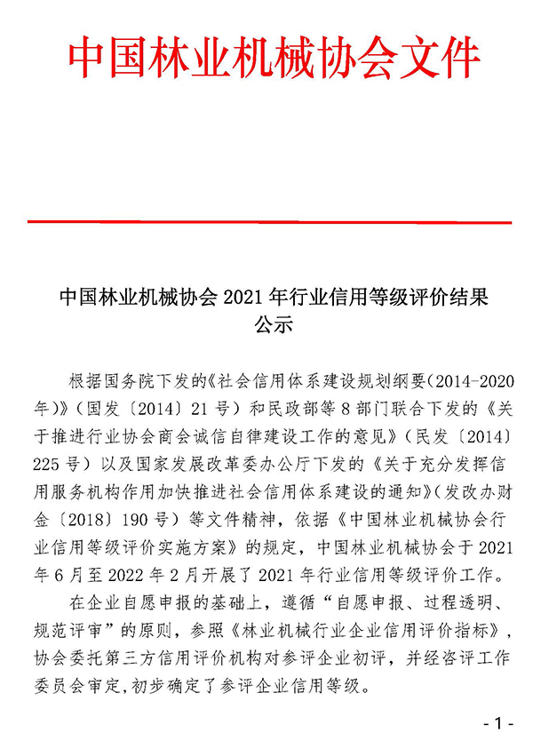 - 中国林业机械协会关于首批行业信用评价结果的通知 2012/08/08
