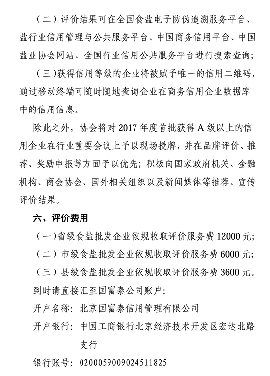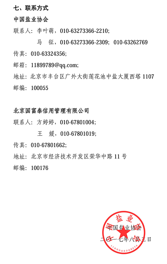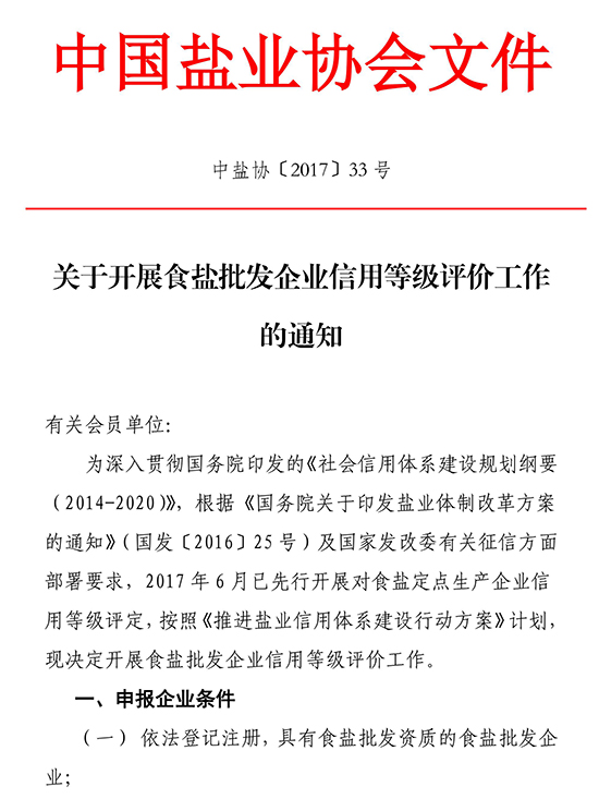 为深入贯彻国务院印发的《社会信用体系建设规划纲要(2014-2020)》,根据《国务院关于印发盐业体制改革方案的通知》(国发[2016]25号)及国家发改委有关征信方面部署要求,2017年6月已先行开展对食盐定点生产企业信用等级评定,按照《推进盐业信用体系建设行动方案》计划,现决定开展食盐批发企业信用等级评价工作。