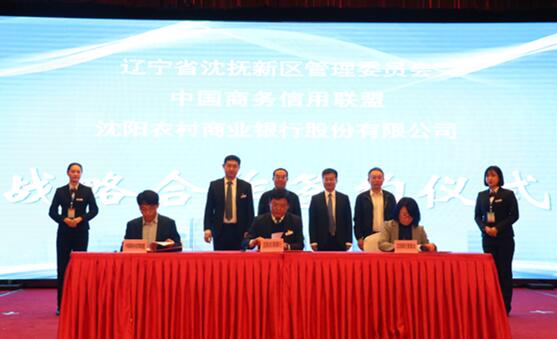 随后,在中国国际电子商务中心党委书记姚广海、辽宁省沈抚新区管委会副主任刘为东、沈阳农商银行行长许磊和中国商务信用联盟理事长陈登立的共同见证下,辽宁省沈抚新区管委会、沈阳农村商业银行股份有限公司和中国商务信用联盟单位签署了战略合作协议,配合新区发展定位,共同打造信用城市示范区。