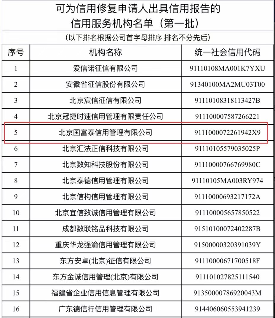 7月2日,国家公共信用信息中心通过“信用中国”网站发布了第一批共62家可为信用修复申请人出具信用报告的信用服务机构名单,北京国富泰信用管理有限公司成功入选。